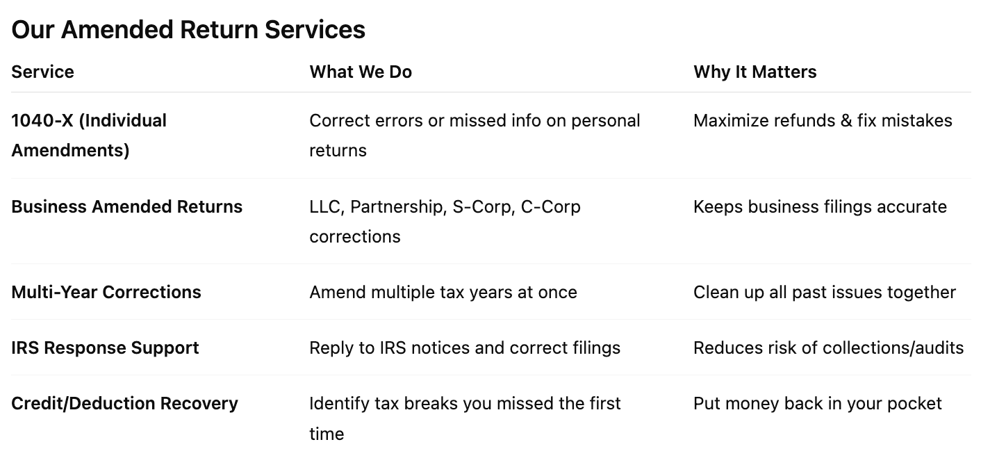 Tax laws are complex, and mistakes happen. Whether you forgot a deduction, reported income incorrectly, or the IRS flagged an error, you don’t have to panic. At Taxes Done Right in Columbus, GA, we specialize in preparing amended tax returns (Form 1040-X and business amendments) so you can correct errors, reduce penalties, and even claim money you might have left behind.