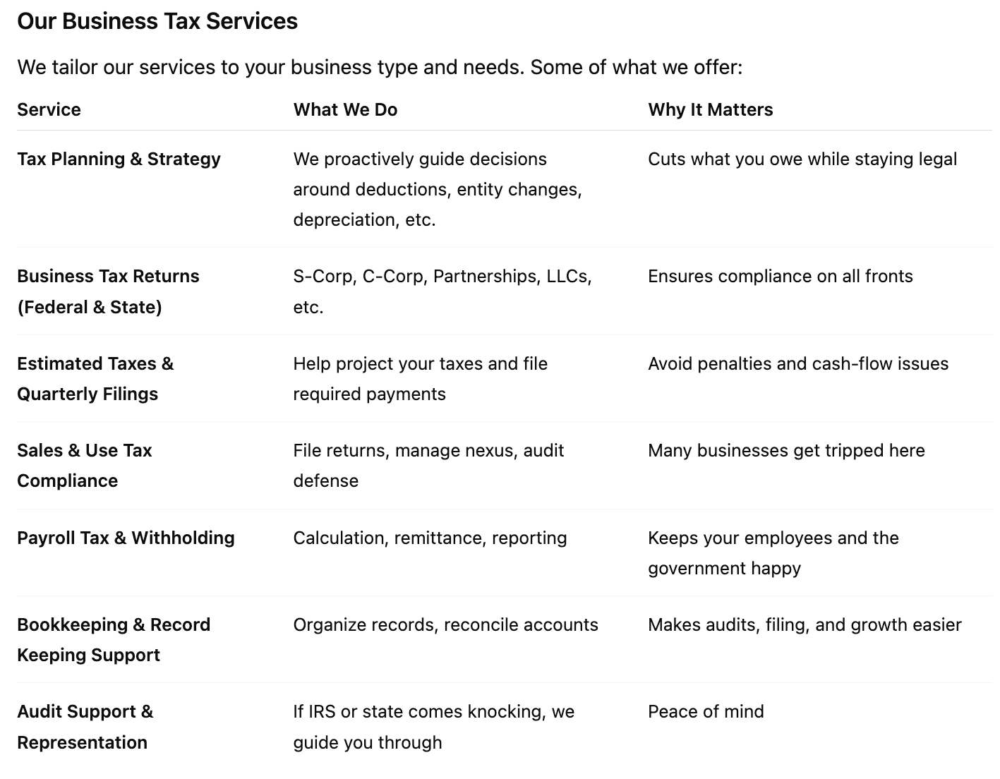 Because every business is different, we’ll build a plan tailored to yours — whether you’re a small LLC or a growing multi-state operation.